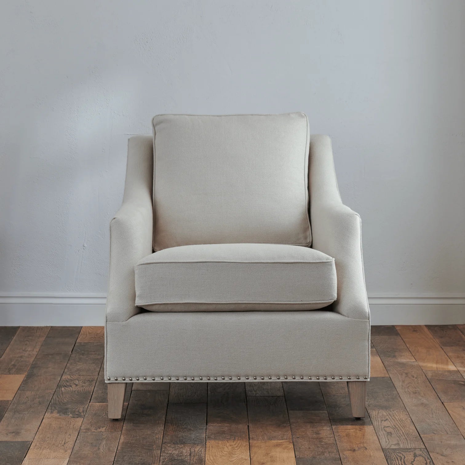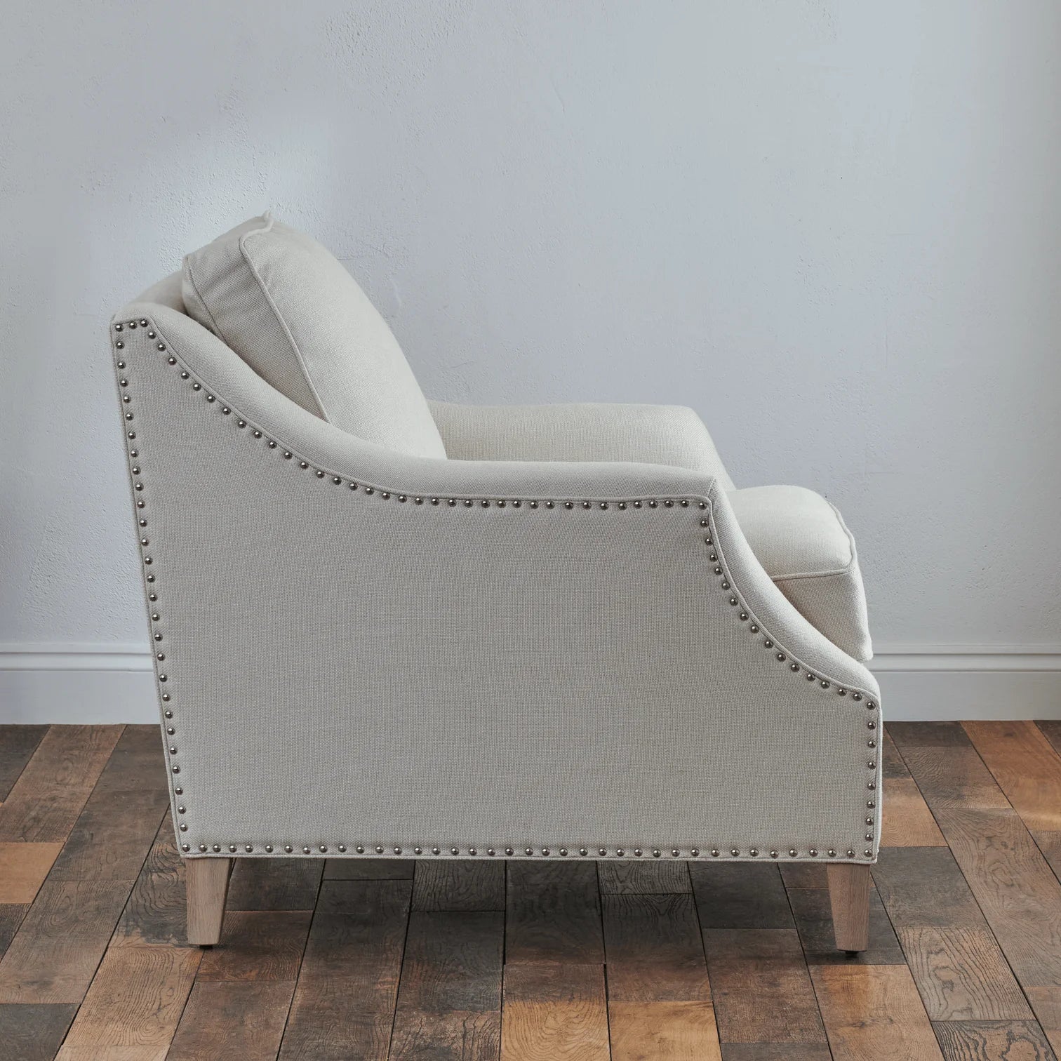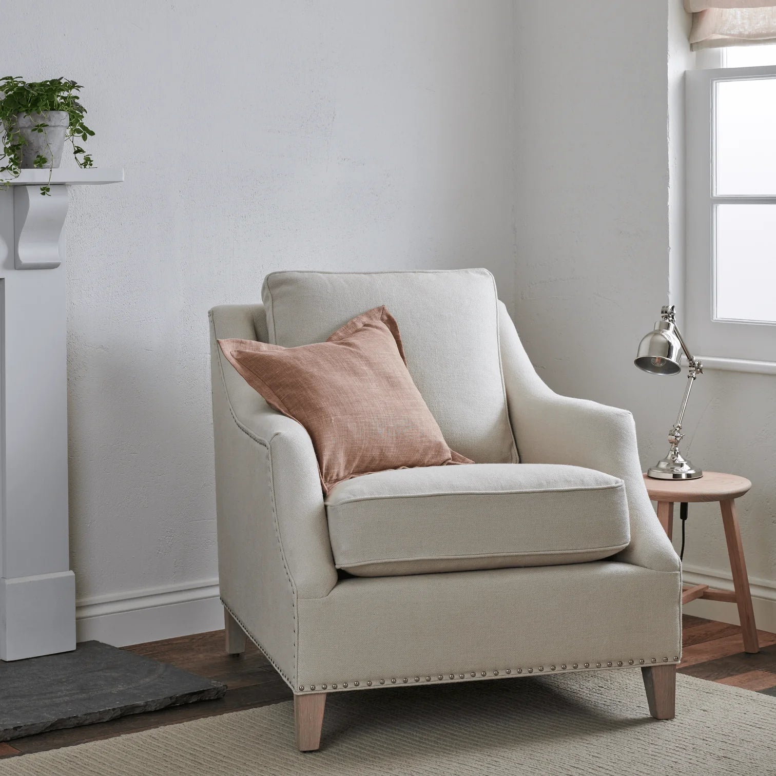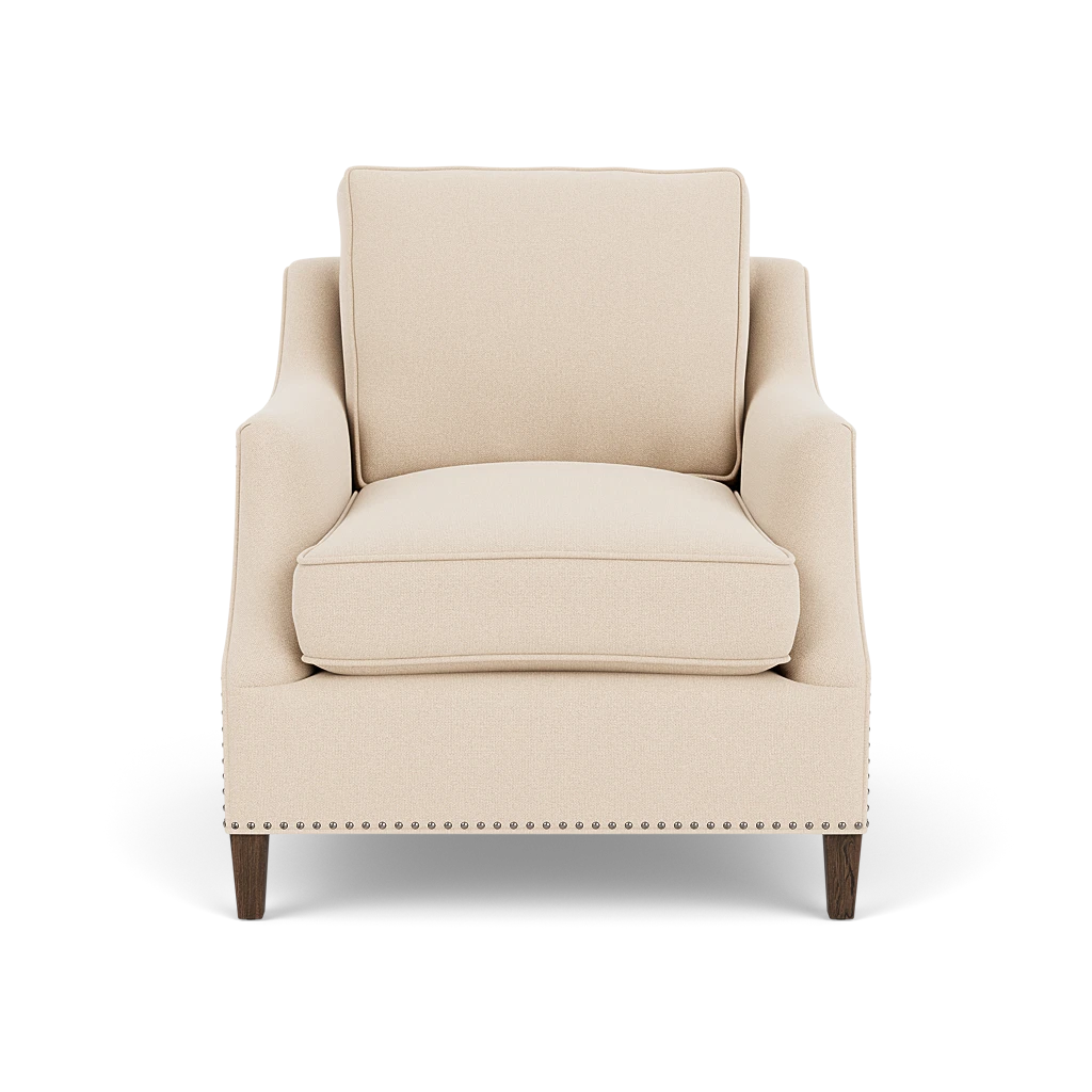 The Neptune Eva Armchair brings a refined, structured feel to living rooms and bedrooms. Its slender arms and subtle stud detailing give it definition, while clean lines keep it crisp and understated.