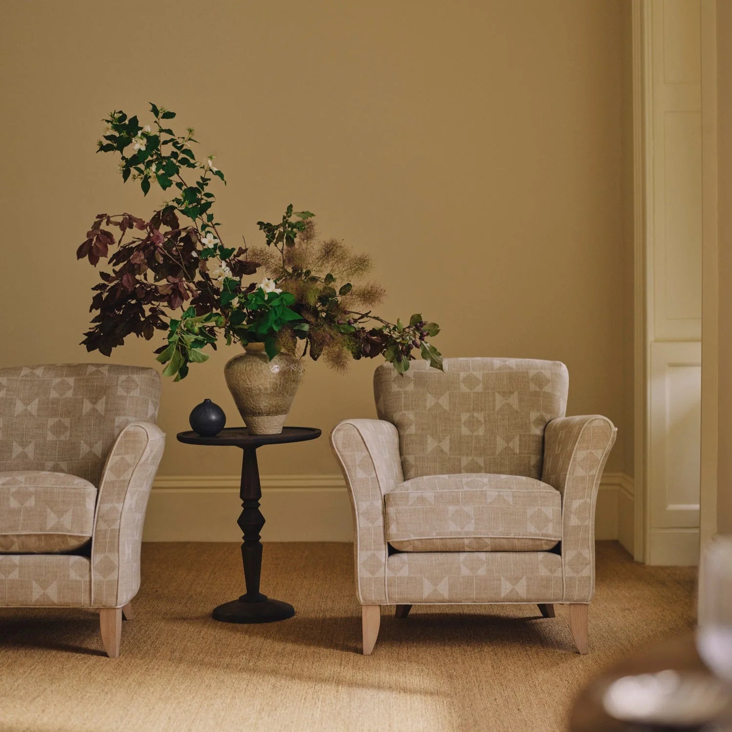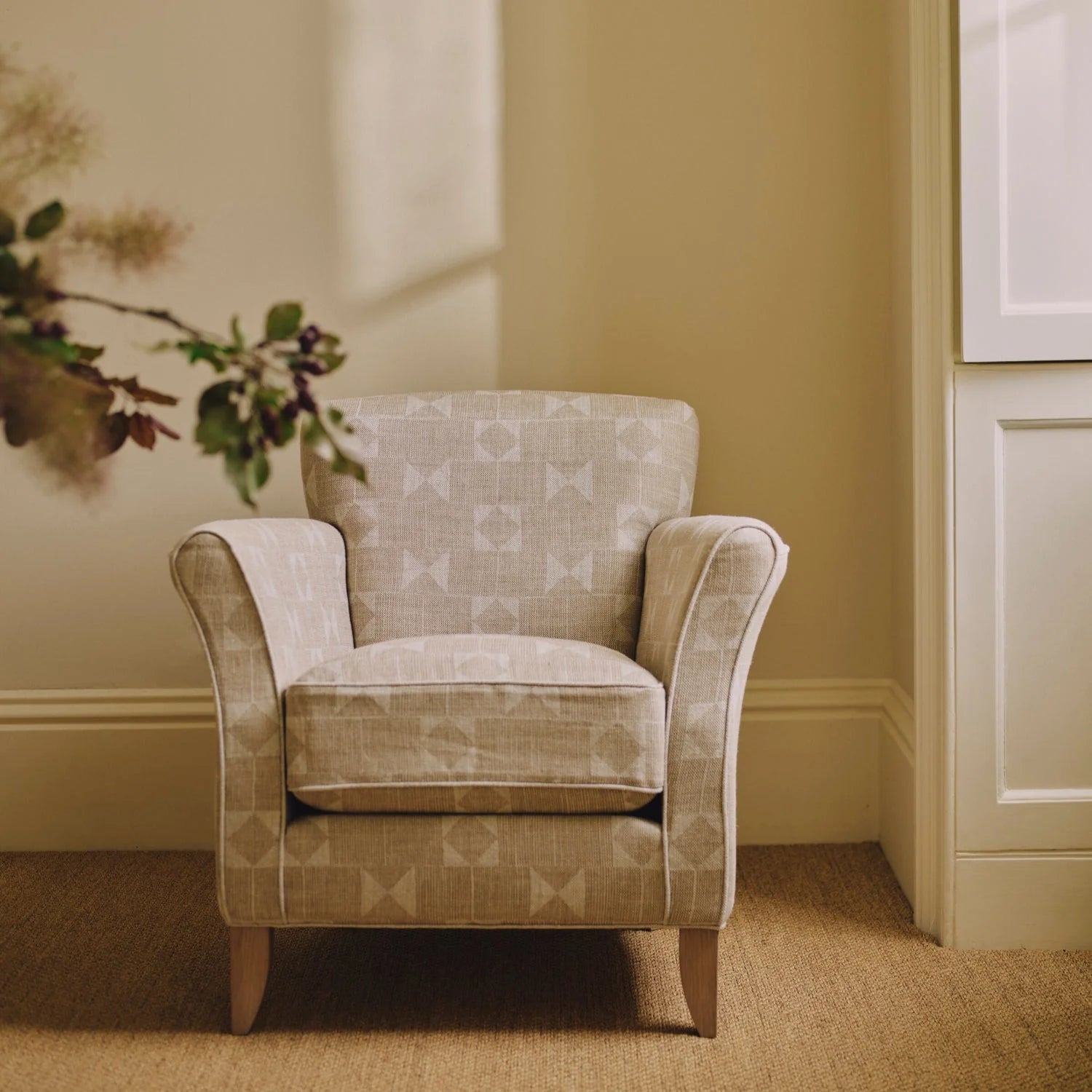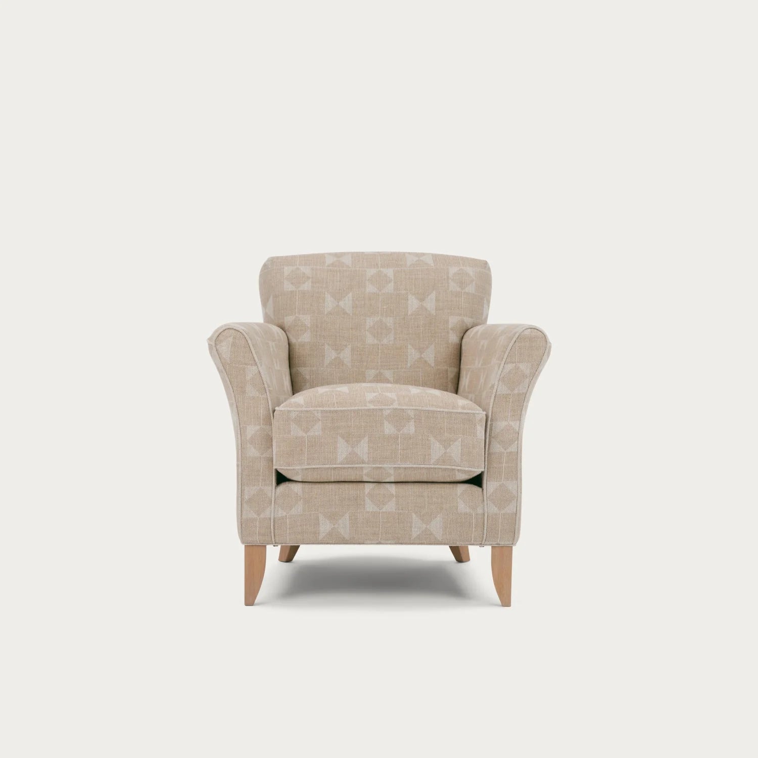 The Limited Edition Neptune Matilda Chair brings warmth and character to smaller living rooms, bedrooms or home offices. Upholstered in Fermoie Flag fabric, crafted from 100% linen, its hand-drawn geometric pattern is finished in earthy neutral tones for a grounded, organic feel.